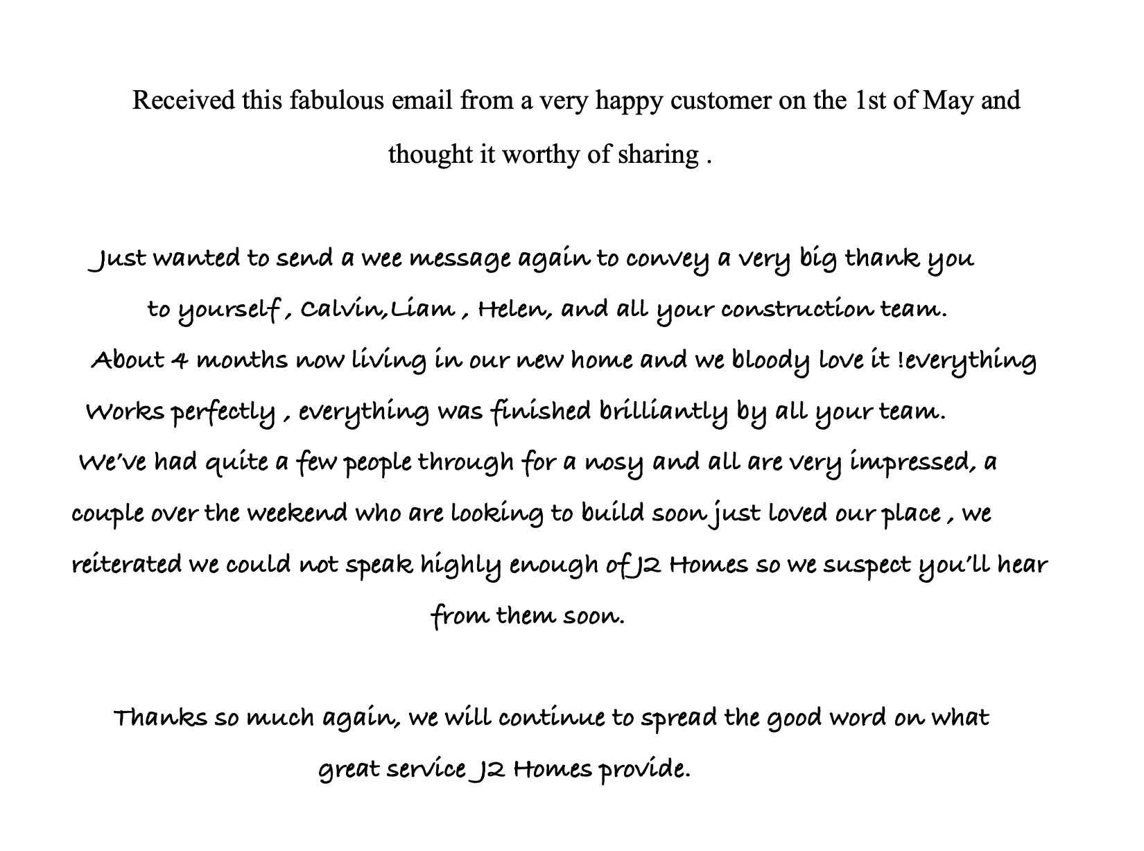It has been a wonderful, worry-free experience and we have no hesitation in recommending Jason, Murray and their teams at J2 Homes Limited for the building of your home.